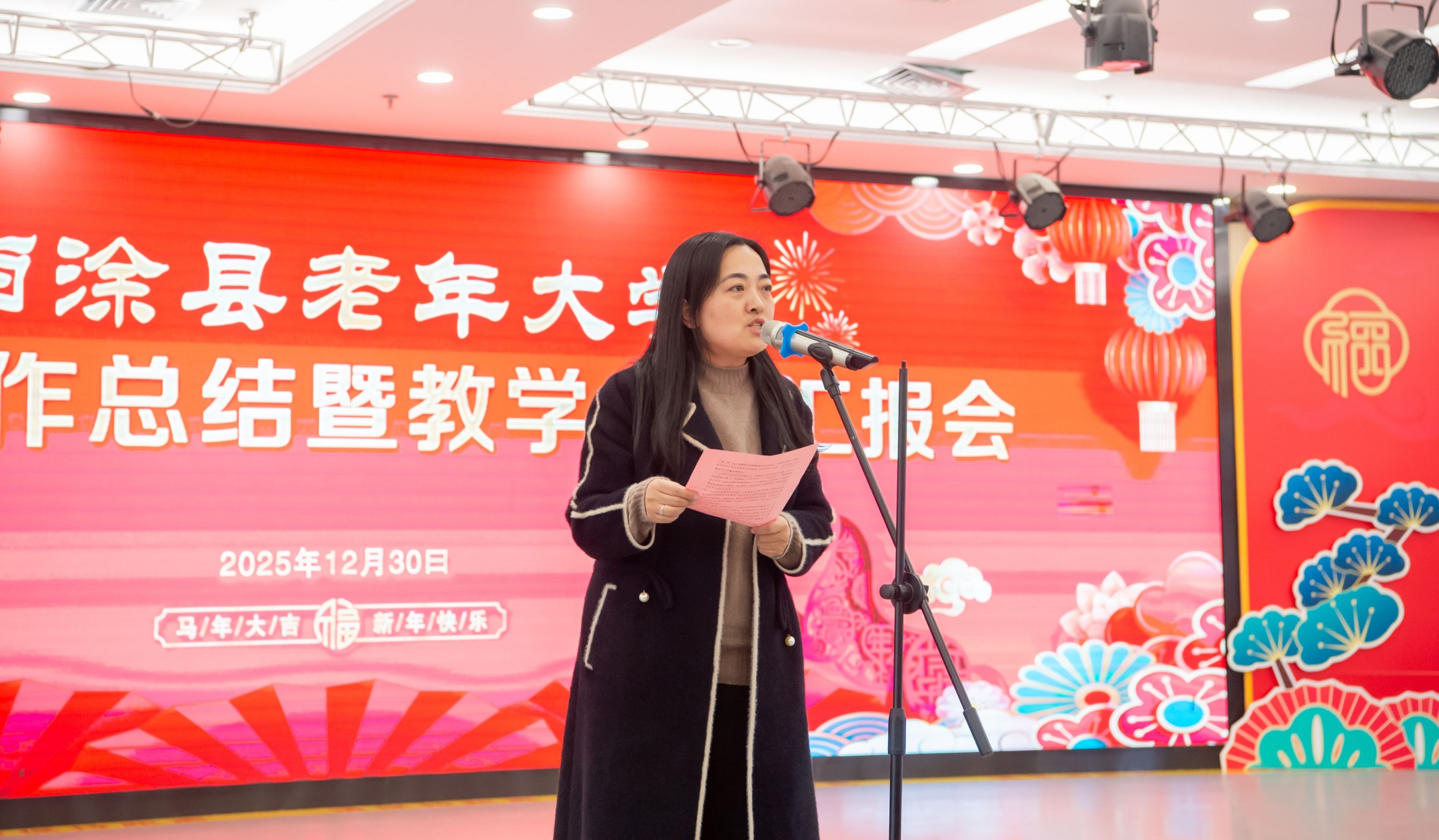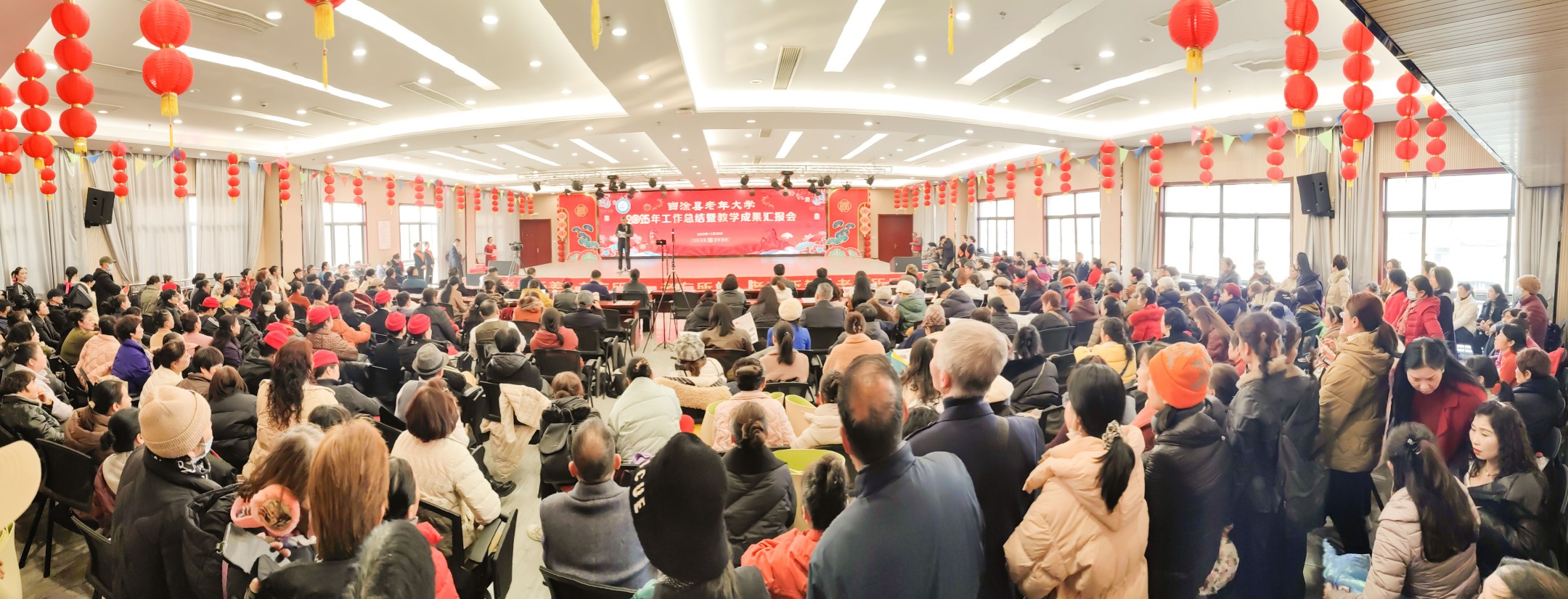 12 月 30 日下午,当涂县老年大学2025年总结表彰大会暨迎新年演出在五楼大厅圆满举行。中共当涂县委组织部副部长、老干局局长、县老年大学校长蒋培,县教育局副局长丁毳毳等领导与学校临时党委、校委会、学委会成员及受表彰的优秀党员、教师、班长、志愿者、学员、“网上学习之星” 等 400 余人齐聚一堂,共话收获、共迎新年,场面热烈而温馨。