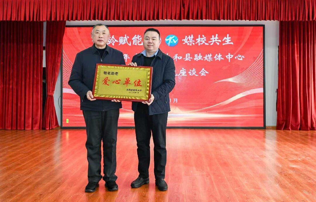 现场,太和县老年大学为县融媒体中心授予《敬老助老爱心单位》匾牌,标志着双方合作正式落地。