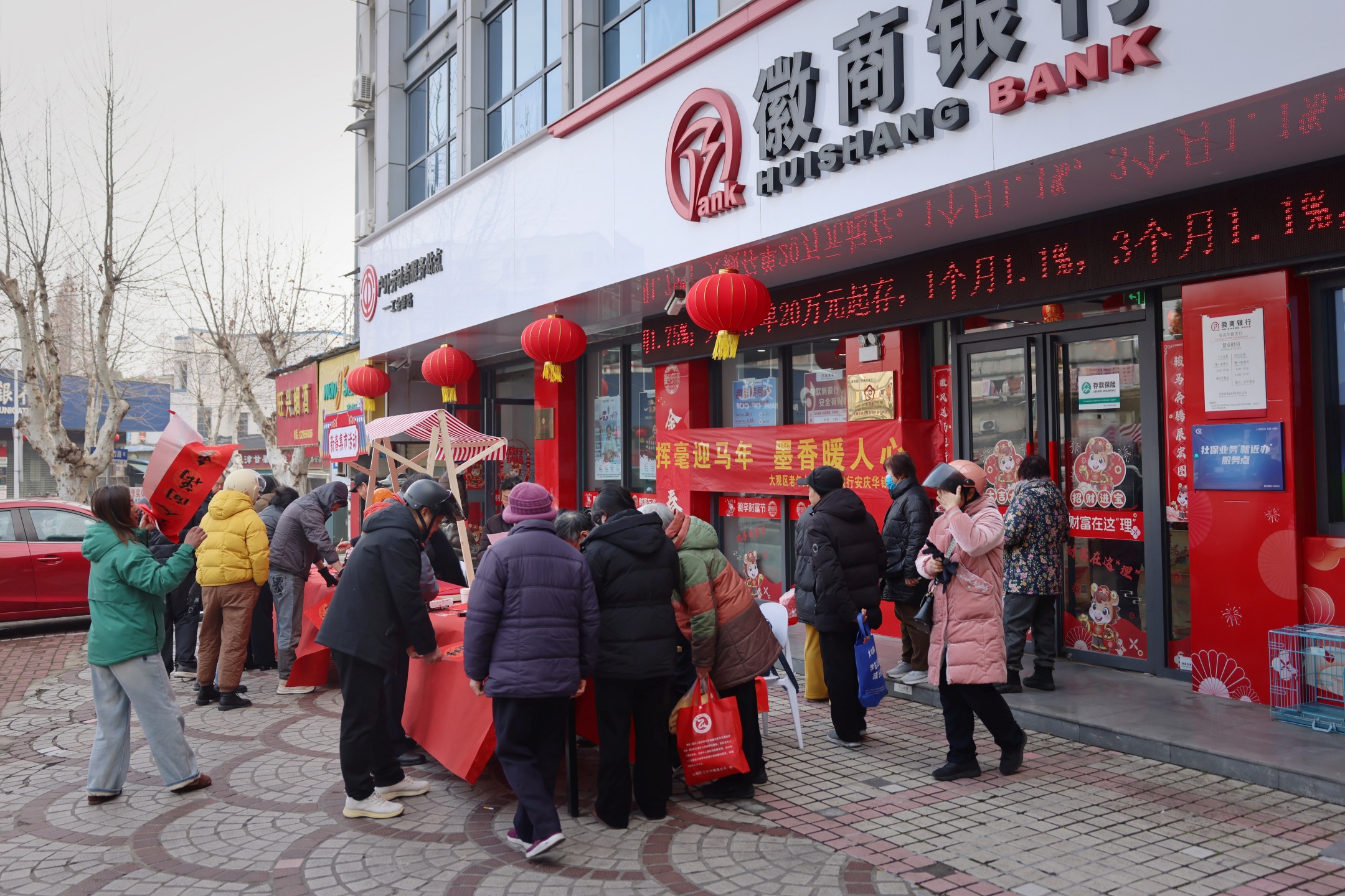 2月3日上午,安庆市大观区老年大学携手徽商银行安庆华银支行,在支行大门口联合举办“挥毫迎马年 墨香暖人心”新春惠民活动,以笔为媒、以联寄情,为辖区居民送上马年新春的第一份手写祝福。
