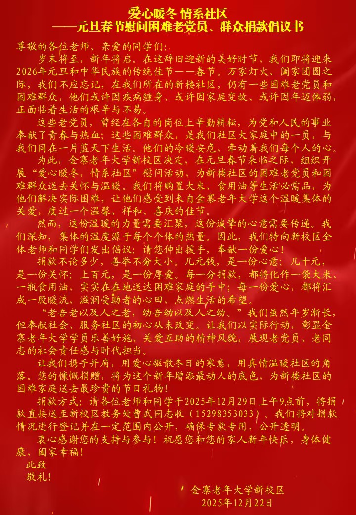 “我们虽然年纪大了,但能为社会再做点事,心里特别踏实。”一位捐款的学员这样说。倡议发出后,师生们积极响应,不分金额大小,每一笔捐款都承载着深深的关怀。目前,慰问物资已经全部送达新楼、江店两个社区的困难家庭。