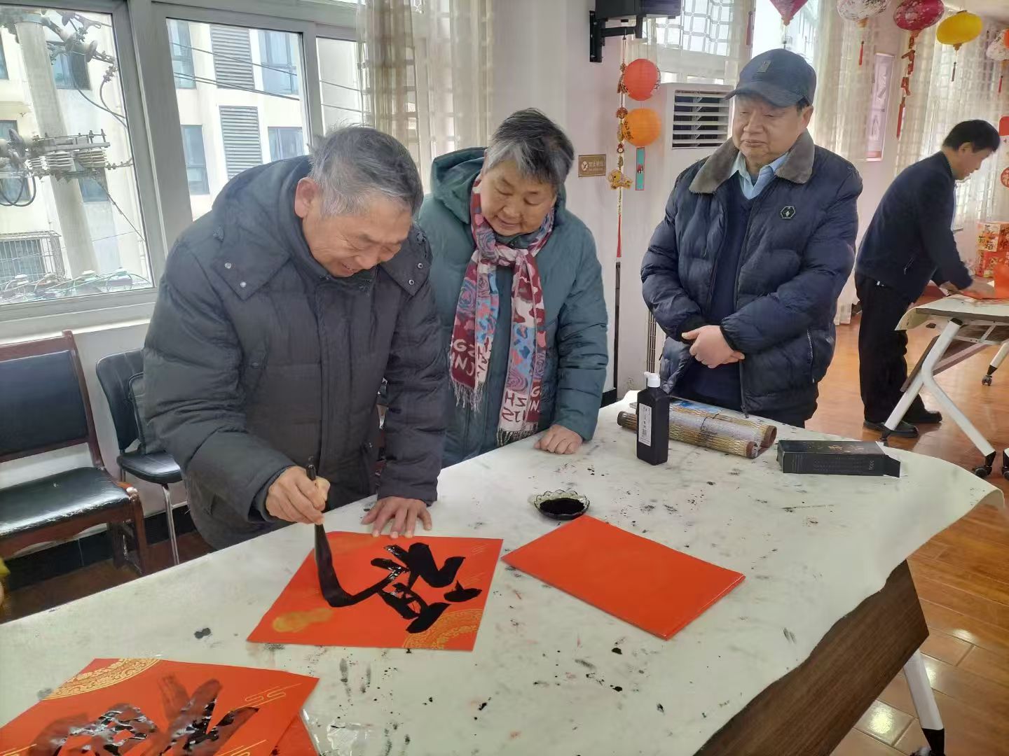 活动现场暖意融融、墨香四溢,气氛格外热烈。老年书法爱好者们齐聚一堂,他们饱蘸浓墨、挥毫泼墨,以娴熟的笔法书写出一幅幅寓意吉祥的春联和大红“福”字,将对新春的期盼、对生活的美好祝愿凝于笔端、融于翰墨,让社区居民在墨香中感受浓浓的年味。
