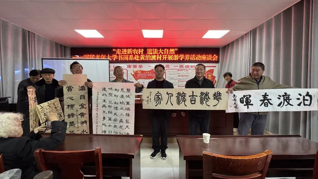 活动后,召开现场研讨会:王曦书记介绍本村新农村建设成果;教师、学员、书画创作者代表陆续发言,畅谈游览感想、游学收获;马有彬副校长讲话:一是表示感谢,代表学校、参加活动人员,向黄泊渡村领导热情接待、精心安排表示衷心感谢;二是畅谈感受,对该村和美乡村建设概括为“六好”,即生态环境好、景点开发好、群众生活好、村支部工作好、党的方针政策落实得好、全村干群精神状态好,不愧为安徽省和美乡村精品示范村,不愧为霍邱县对外开放的一张靓丽名片,也不愧为霍邱老年大学选定的游学养教学基地。三是表达感想,肯定此次活动取得圆满成功,不仅是一次简单的参观游览,也是一堂学习先进的思政课,还是一堂别开生面的专业课,更是一堂不忘人民、回报社会的感恩课。
