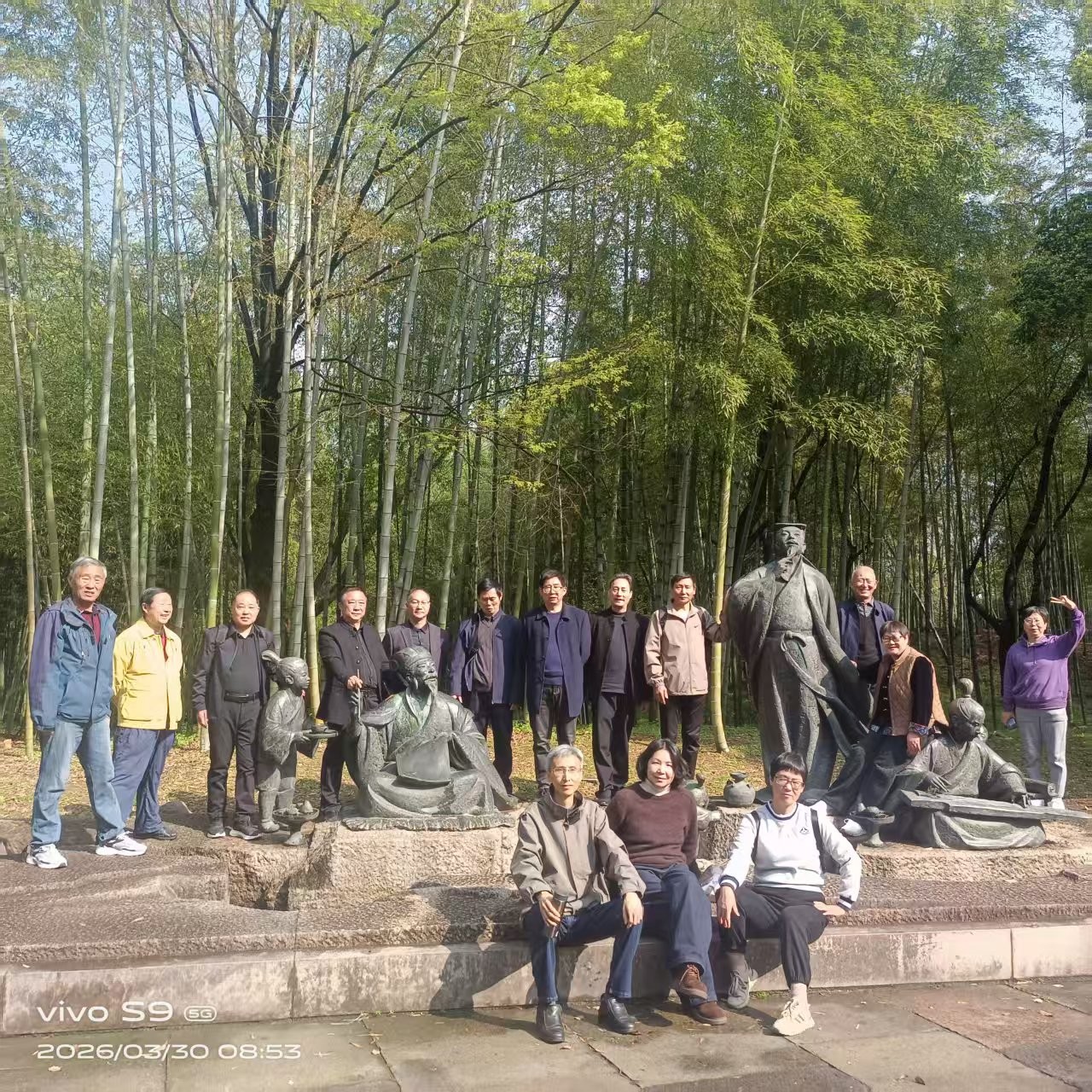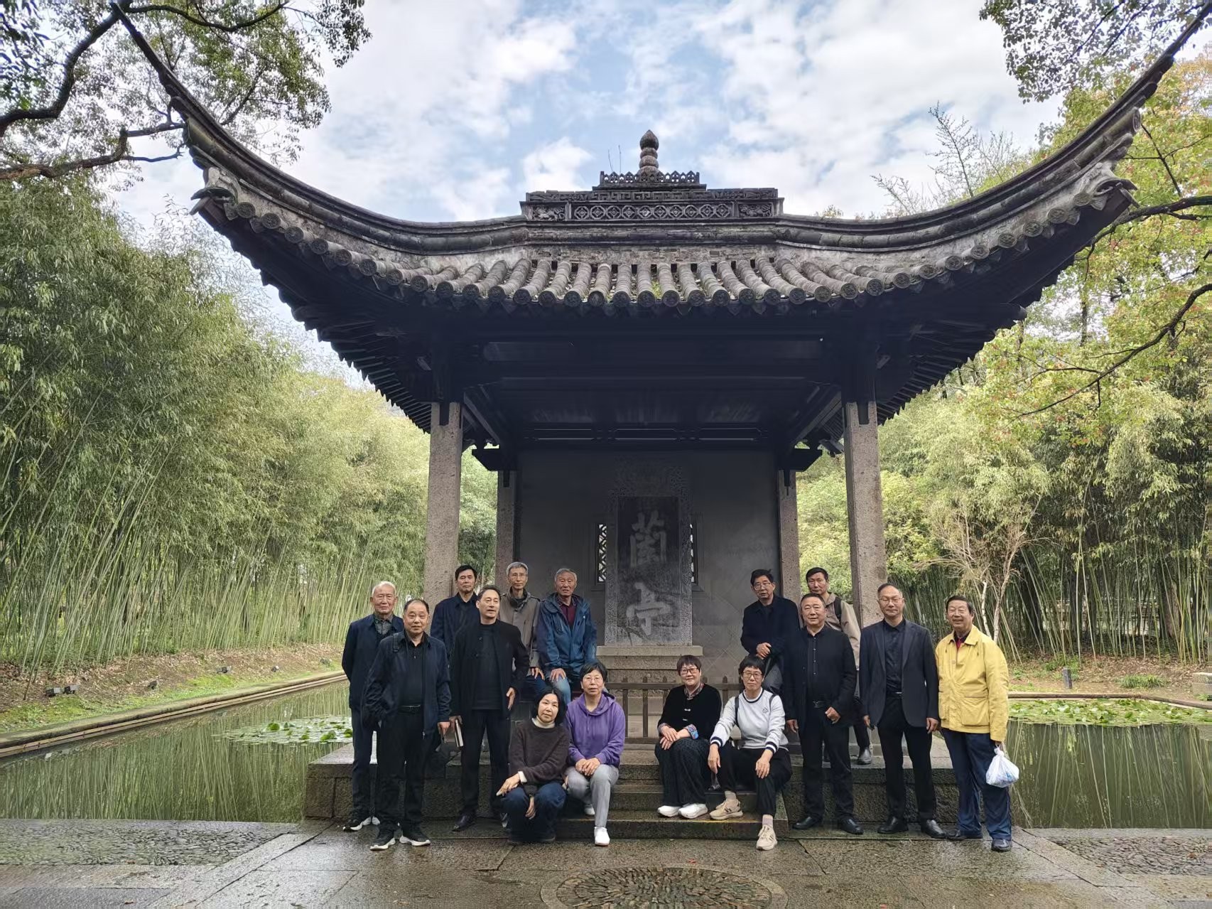 绍兴之旅的主要目的地是影响中国千年书法的兰亭圣地,是学员们的圆梦之地。一踏进这方圣土,就见圣人酒过三巡,醉醺醺地靠着石壁躺着,袒胸露肚,双眼曚昽,左手指着同行者,仿佛在说,该你饮酒作诗了。一行人有仰头吟诗的,有俯首抚琴的,有托须沉思的,有酒杯在唇齿边暂停住的……个个栩栩如生,惟妙惟肖。走进“文人天趣清犹水,贤者风期静若兰”的校门,只见此地有崇山峻岭,茂林修竹,曲水迂回,顿觉此地乃幽静之处。走近鹅池,鹅池碑(相传王羲之、王献之父子合书)映入眼帘。几只大白鹅或引吭高歌,或脖子一伸一缩,或埋头打盹。据导游介绍,王羲之的众多“之”字绝不雷同是受鹅脖的启发,看看也像是。来到流觞亭,此时,“天朗气清,惠风和畅,又有流觞曲水,清流激湍,映带左右。”真是应景。大家列坐在石块上,树叶飘过时,学员情不自禁吟诵起《兰亭序》,老顽童们体悟曲水流觞雅韵,沉浸式感受魏晋名士的风雅。进入亭内,大家细细欣赏42贤士饮酒作诗图长卷。蒋竺江老师一边鉴赏瑰宝,一边或答疑解惑,或滔滔不绝讲解名人趣事,或引经据典,讲解书画艺术的来龙去脉、前世今生。