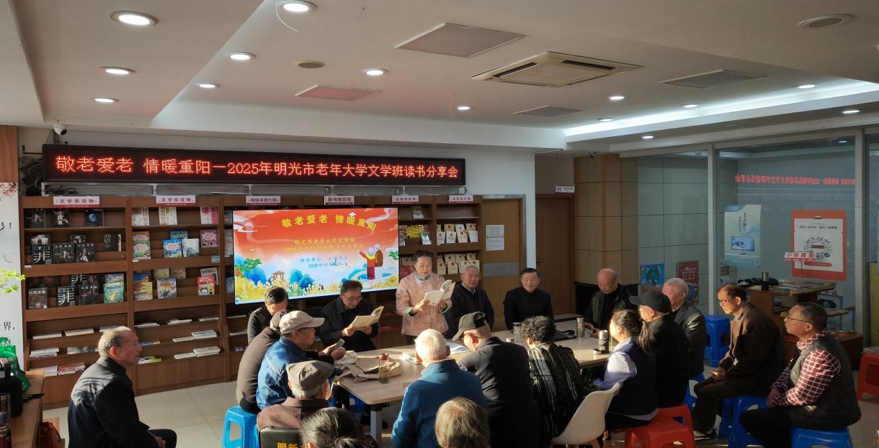 明光市老年大学文学班组建于 2016年3月,以满足老年人精神文化需求为宗旨,聚焦学与乐,开设诗歌、散文、古典文学赏析、写作等课程,为老年文学爱好者搭建学习交流平台,成为大家追寻文学梦、丰富晚年生活的精神家园。办班以来,累计吸引 260 余名老年朋友参与,每学期注册学员约 50 名,年龄均在50周岁以上,现有80周岁以上学员12名。