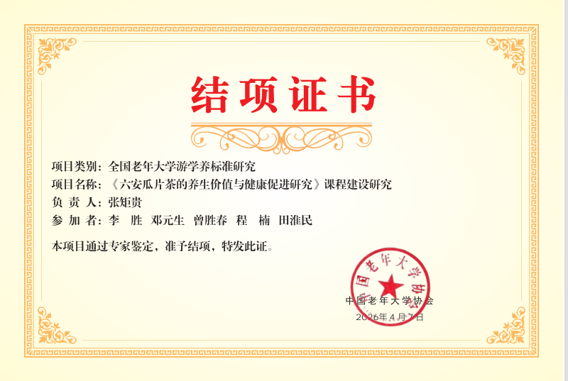 近日,六安市裕安区老年大学《六安瓜片茶的养生价值与健康促进研究》课程建设课题,通过《全国老年大学游学养标准研究》专项评审,获得中国老年大学协会颁发的结项证书。这是该校第二次获得中国老年大学协会认可的教研成果。