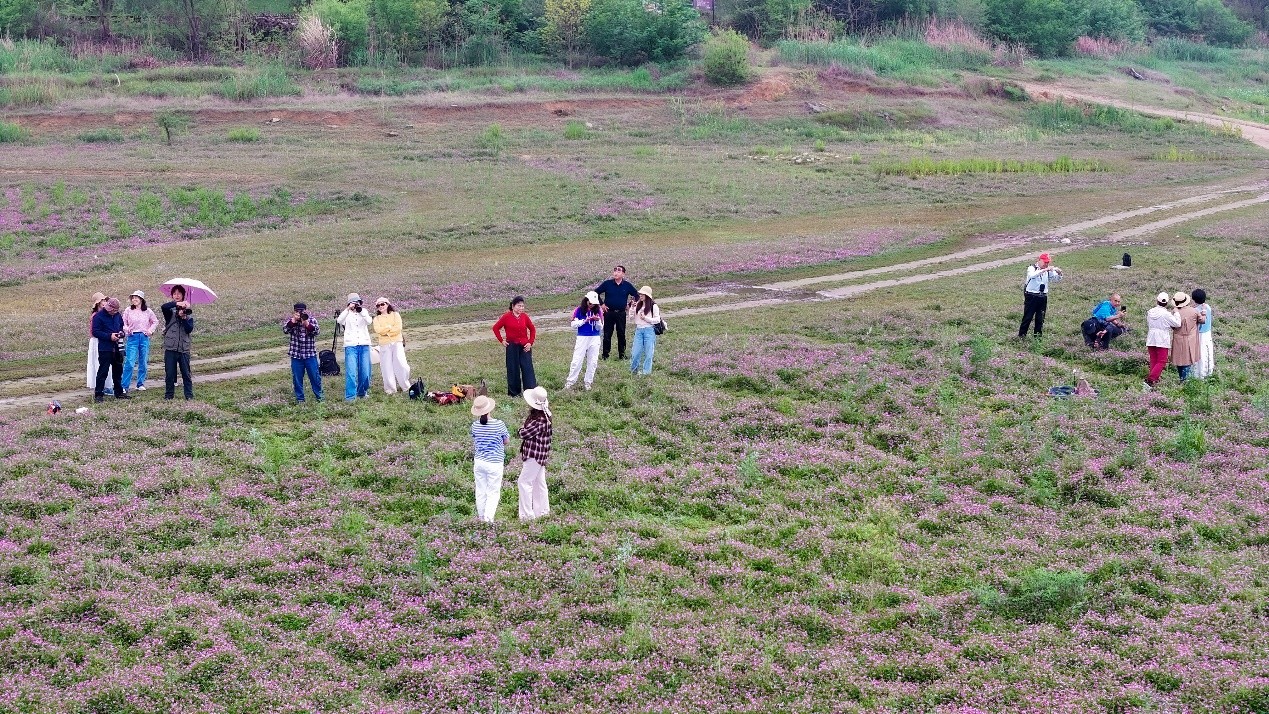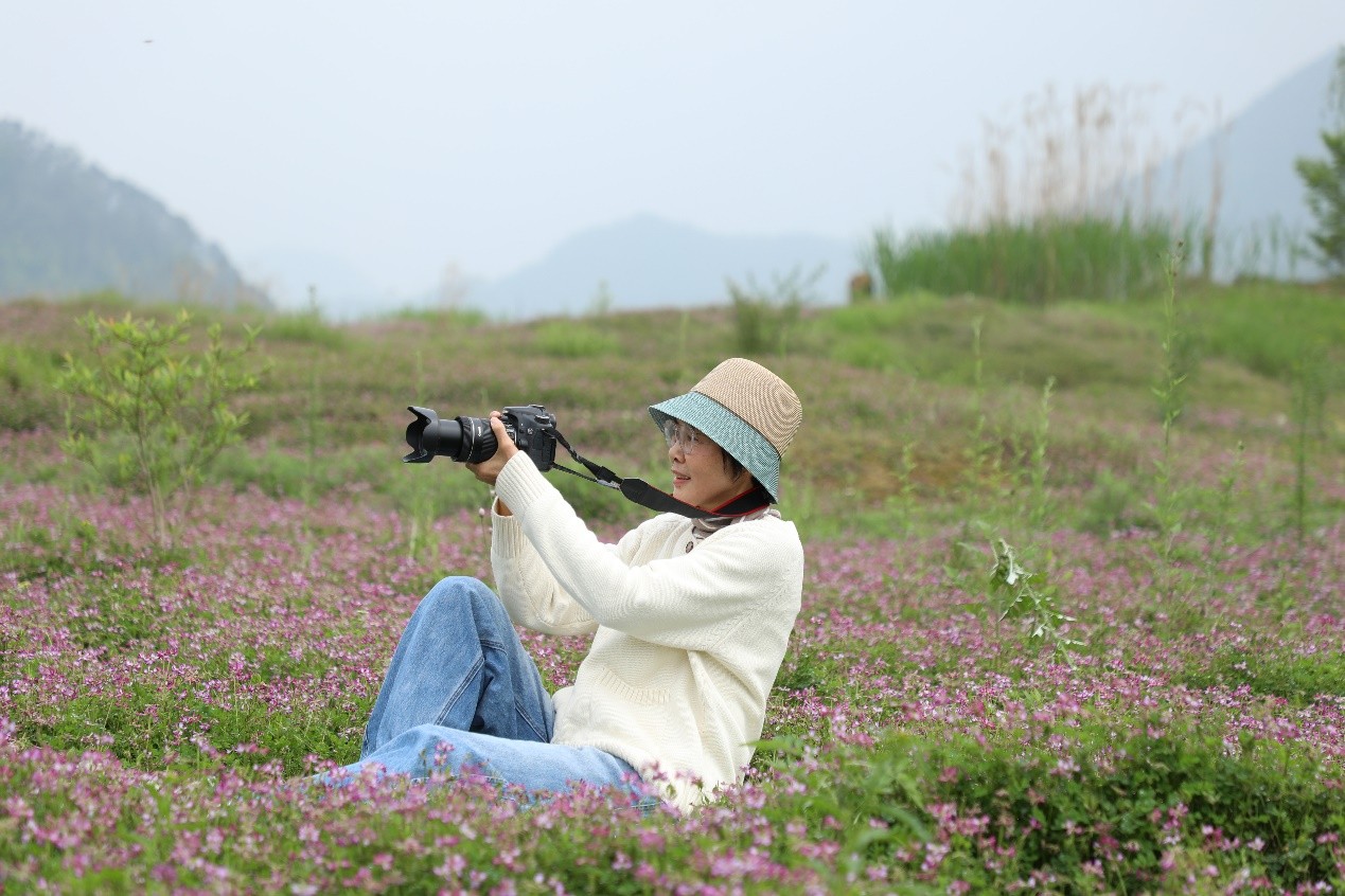 随后,学员们分散开来,各自寻找心仪的拍摄点。有的学员选择站在高处,以俯瞰的视角拍摄花海与湖面的全景,展现出大自然的广阔与壮丽;有的则蹲在花丛中,专注于拍摄紫云英的特写,将花瓣的纹理和露珠的晶莹都清晰地记录下来;还有的学员以湖面为背景,捕捉花海中随风飘动的花枝,为画面增添了一份灵动与诗意。