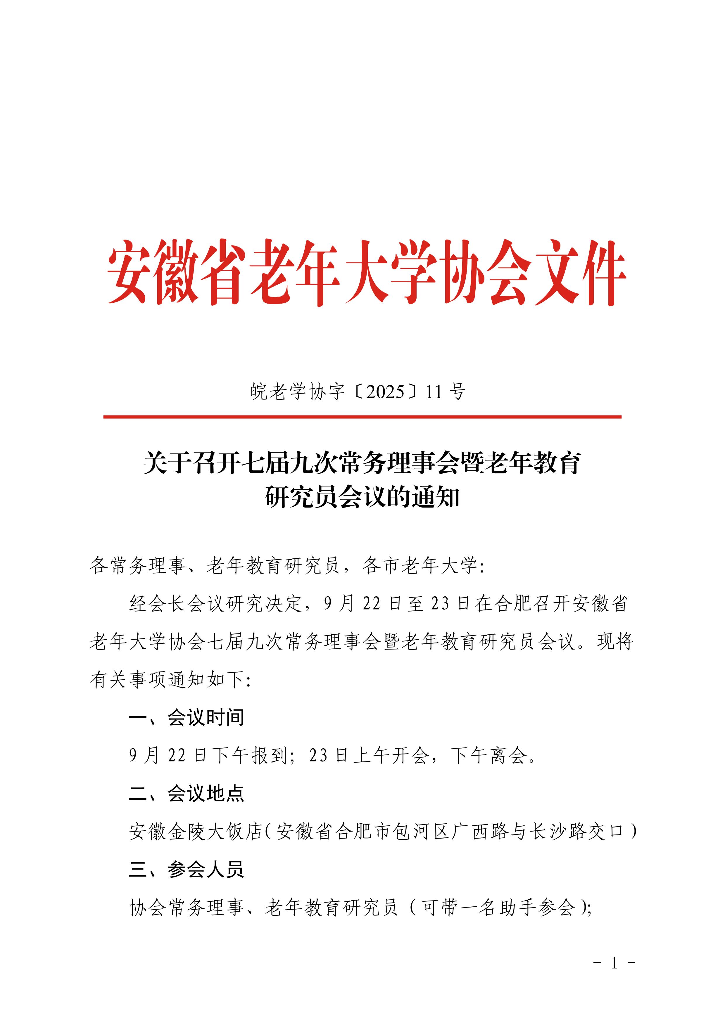 关于召开七届九次常务理事会暨老年教育研究员会议的通知