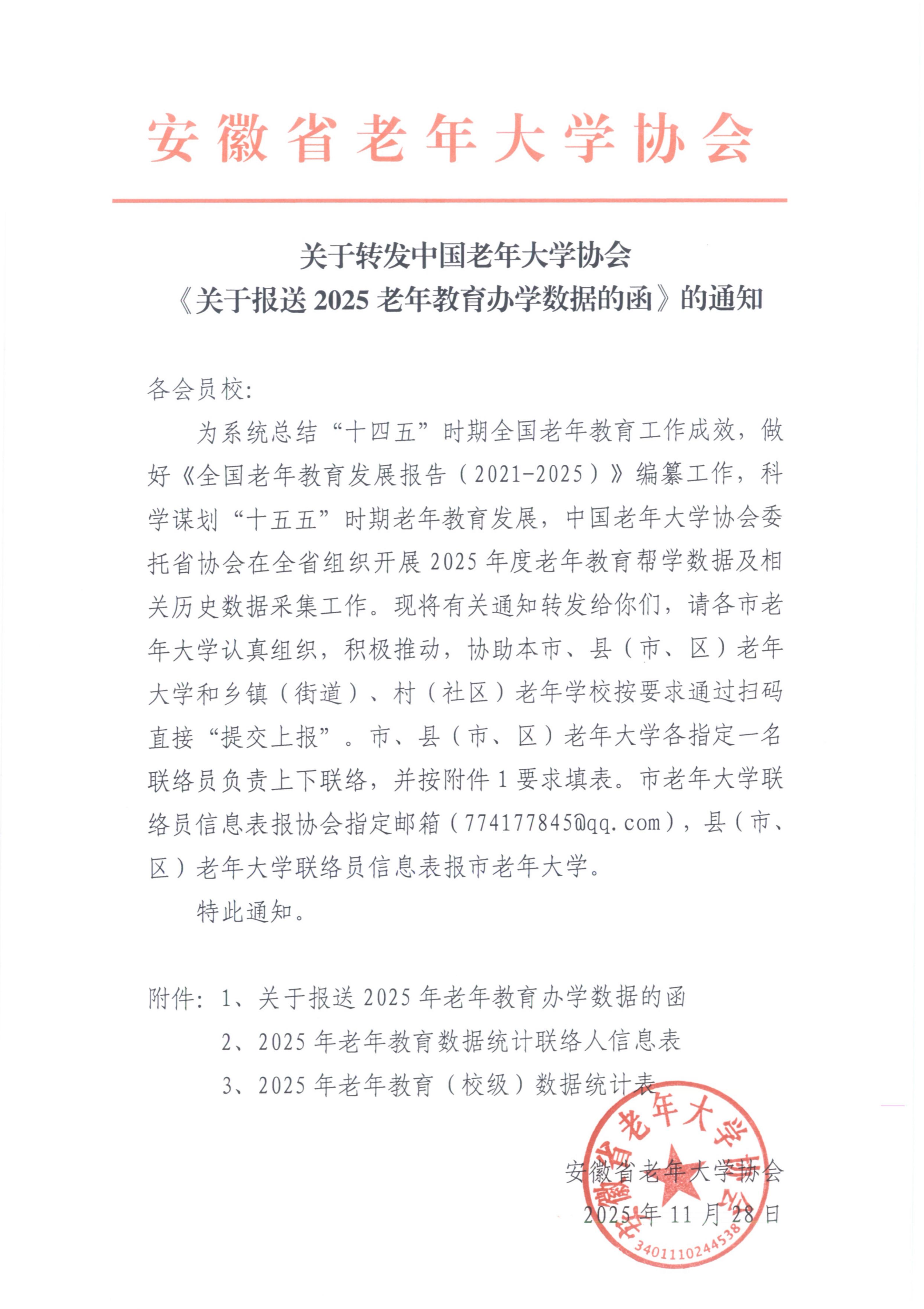关于转发中国老年大学协会 《关于报送2025老年教育办学数据的函》的通知