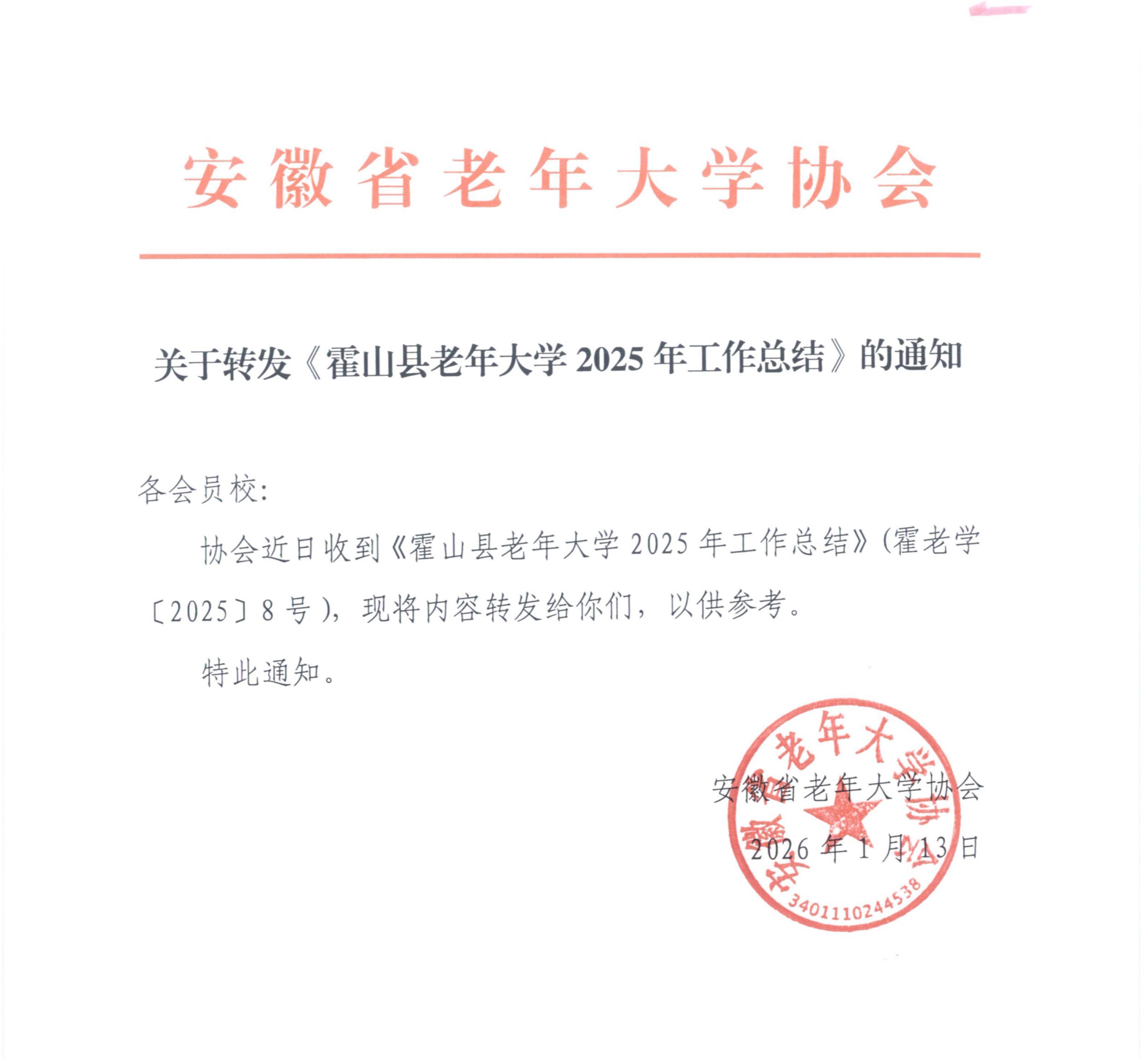 关于转发《霍山县老年大学2025年工作总结》的通知