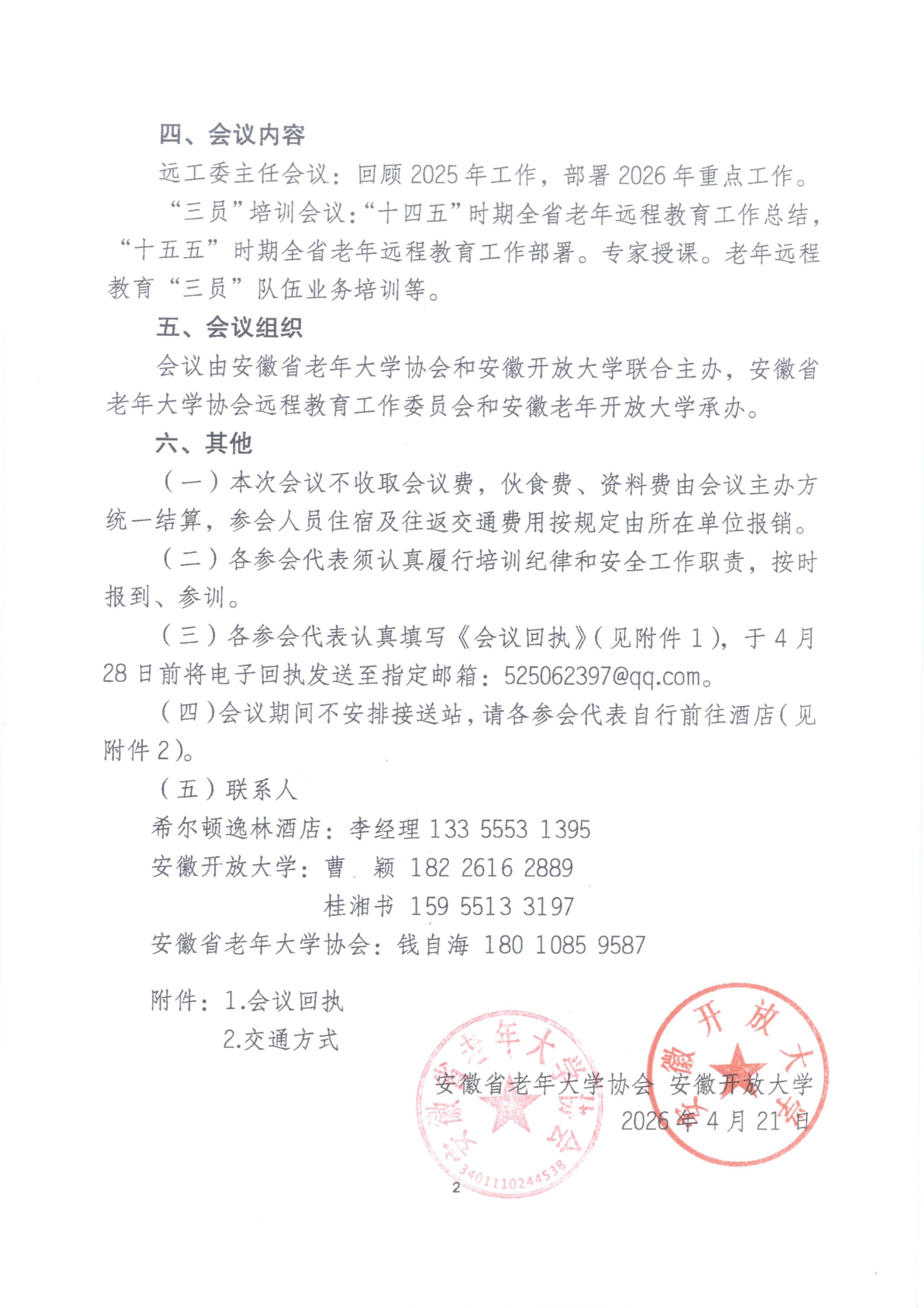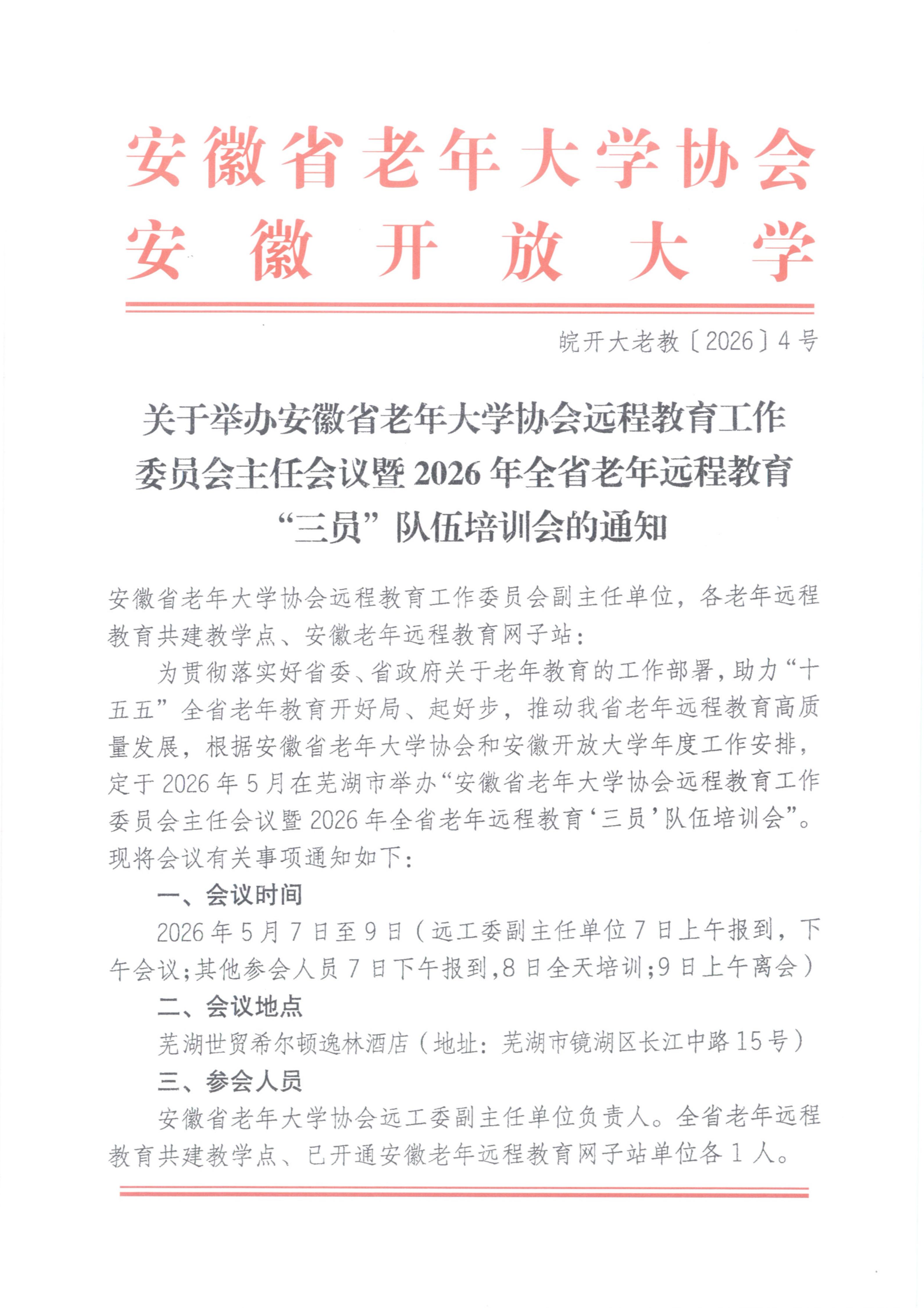 关于举办安徽省老年大学协会远程教育工作委员会主任会议暨2026年全省老年远程教育”三员“队伍培训会的通知.pdf