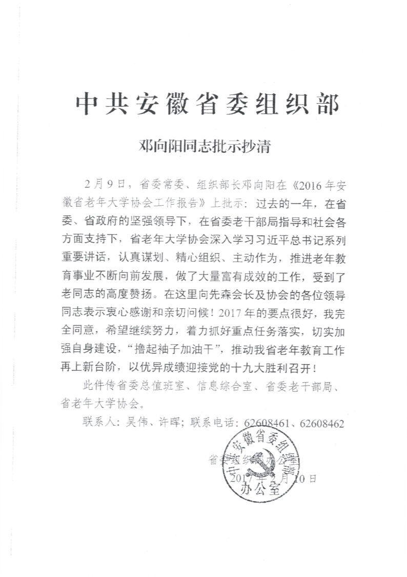 中共安徽省委组织部邓向阳同志批示抄清