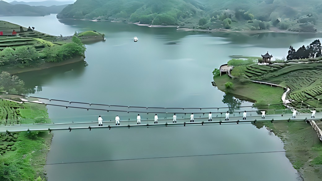 乘船返程后,队伍来到美丽的西茶谷。穿行于茶园之间,一座吊桥横跨溪谷。队员们立于桥上,再次演绎太极之美。桥下流水潺潺,桥上衣袂飘飘,太极的刚柔并济与自然的灵动秀美融为一体,引得游人纷纷驻足赞叹。
